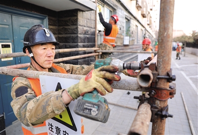 4月18日,工人正在呼和浩特市玉泉区芳清园二区(南区)内搭建脚手架。当日,呼和浩特市首批77个老旧小区改造工程集中开工。今年,呼和浩特市将对309个老旧小区进行改造翻新,总建筑面积420万平方米,概算投资18.3亿元,惠及51085户。 本报记者 王磊 皇甫秀玲 摄