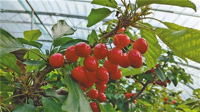 春光正好,通辽市奈曼旗青龙山镇四一村樱桃大棚内生机盎然,红艳艳的大个“美早”樱桃犹如一颗颗红宝石,晶莹剔透,缀满枝头。望着枝头上的累累果实,陈志龙心里乐开了花。