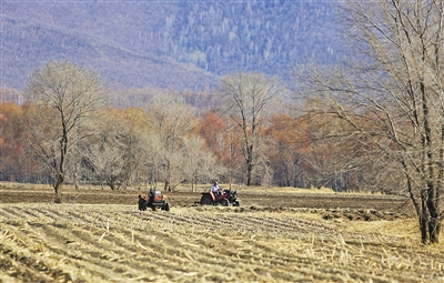 扎兰屯市卧牛河镇农民进行翻地保墒。 文/图 李世国