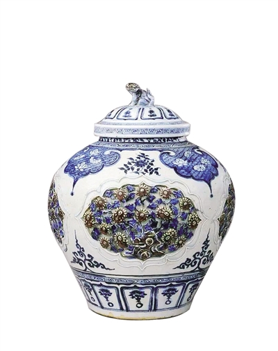 盖罐采用彩绘、镂雕、堆贴等多种复杂工艺烧制而成,时代特征明显,是元代青花瓷器中具有断代作用的标准器。其青花和釉里红集于一器,青花青幽湛蓝、明净素雅和釉里红浓艳深沉、雍容华贵交相辉映,颇具艺术感染力。罐腹部开光纹饰采用贴花技法,使器物的平面装饰又增添了几分镂雕艺术的立体效果。
