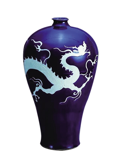 霁蓝釉是珍贵的进口青料——苏泥勃青掺入石灰碱釉中,在1280摄氏度至1300摄氏度的高温中一次烧造而成。霁蓝釉的烧造对温度要求极高,温度太高会流釉,温度太低则发色灰暗,成品率极低,加上进口青料极其昂贵,因此霁蓝釉只能为官窑所垄断,专门用于祭天,又称“祭蓝”。元朝时景德镇的各大瓷窑被朝廷管辖,专门为皇室贵族烧制瓷器。这种精美的霁蓝釉白龙纹梅瓶由于其图案的特殊性,只允许收藏于皇宫中。截至目前,经过验证,全世界仅存3件,分别藏于北京颐和园、扬州博物馆及法国巴黎集美博物馆。其中,扬州博物馆收藏的这件梅瓶器型最大,造型秀挺,釉色净润,纹饰精美且生动活泼,气势磅礴,是梅瓶中的极品。