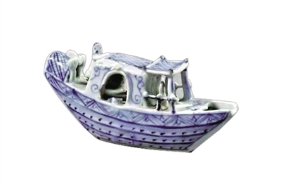 1993年,广州博物馆收藏了一件元青花船型水注。水注高7.5厘米,长15.5厘米,宽4.2厘米。水注形似小船,首尾狭窄,中间较宽,船首设有凹形流水槽。船分中舱和后舱,中舱前有一个篷,两边有栅栏,篷下有两个女俑盘坐,面向前方,中舱两侧的拱形窗口下堆塑假石山。船尾处立一艄公,倚舱站立,双手放在舱顶,头侧向左前方。