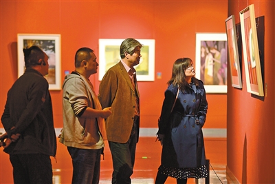 4月20日,观众在内蒙古美术馆观赏水彩画。当日,为了学习宣传贯彻党的二十大精神,内蒙古自治区首届水彩画双年展在内蒙古美术馆开展。本届双年展展出100余幅作品,包括前辈艺术家们的精品力作和中青年水彩画家们不断探索的创新佳作,将新时代内蒙古水彩画蓬勃发展的繁荣景象精彩呈现。本报记者 王磊 摄