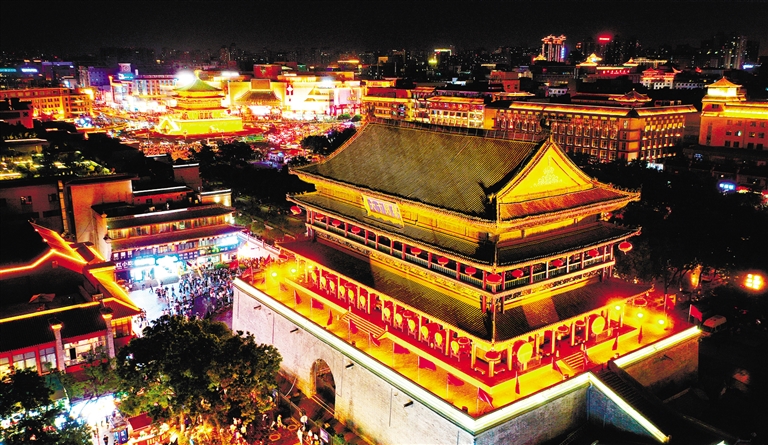 西安鼓楼夜景(5月2日摄,无人机照片)。古之长安,今之西安。作为十三朝古都,西安有3100多年的建城史和1100多年的建都史,留下了钟楼、城墙、大雁塔等诸多承载历史印记的地标性建筑。近年来,大唐不夜城、大唐芙蓉园等新兴文化景区的火爆“出圈”更是带给人们新的感观盛宴。如今的西安,古之传统文化与今之城市风貌融会贯通,古老的文物古迹与全新的时代命题碰撞出夺目的火花。 新华社记者 刘潇 摄