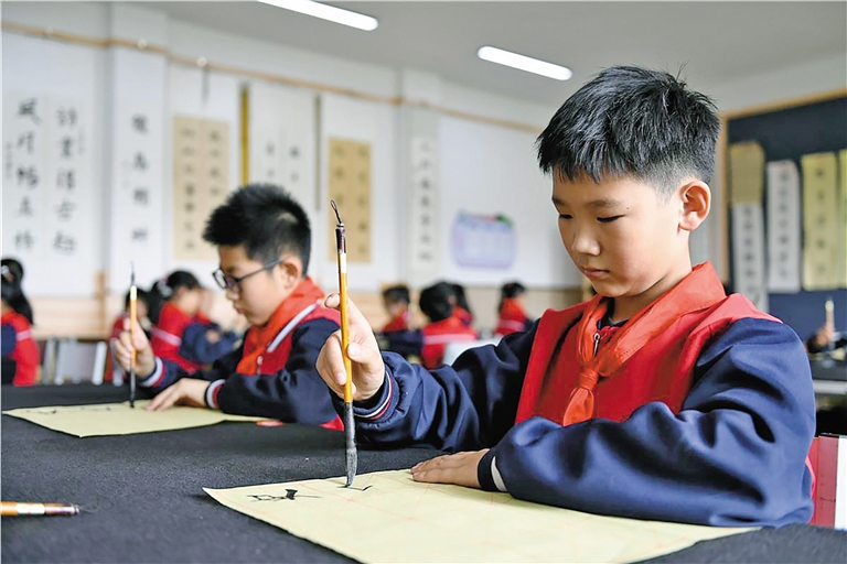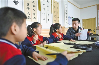 在学校书法室,学生们坐姿端正,在书法老师的带领下一笔一划临摹汉字,尽管年龄不大,但大家写出的字工工整整。“学校不仅开设了书法课,成立了书法社团,还创编书法辅导资料8册、习字本12本供学生使用,这也极大调动了学生的书写热情。”校长王果盛告诉记者,作为被中国书法家协会命名的“兰亭小学”,学校围绕“写好人生每一笔”的办学理念,实施特色兴校的发展方略,注重翰墨文化建设,逐步形成了“以书润德、以书育美、以书立志、以书圆梦”的育人体系。