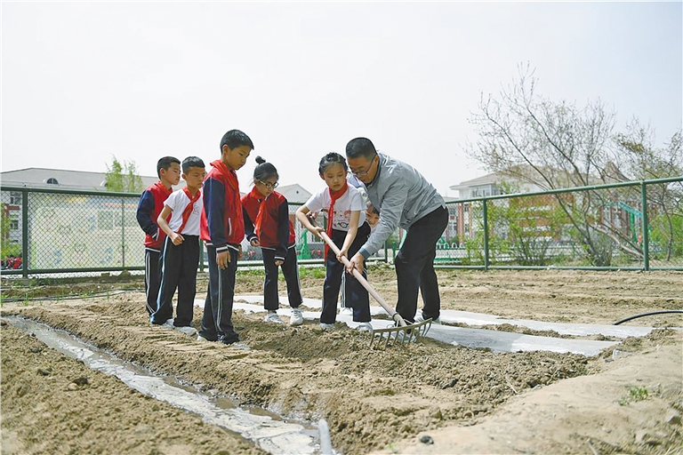 在学校北侧的空地上,学校专门划出一片区域作为劳动实践基地的种植园,每班每周都会在这里安排一节劳动实践课程。在这里,学生们可以体验蔬菜从栽植、施肥、锄草到采摘等收获全过程。“劳动实践课既让学生受到劳动教育,又学得了一门实用技术,还培养了其动手动脑探索精神。”王果盛说。