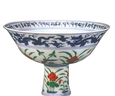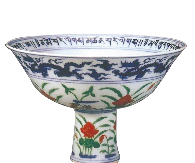 青花五彩高足碗因为有便于端拿的高足而得名,盛行于元代,明、清两代继续烧造。文中高足碗高11.5厘米,口径12厘米,外侧有青花云龙纹,上下共有青花弦纹三道,形成一个装饰区间;圈足外壁绘海水纹,龙纹边饰以下有莲池鸳鸯纹饰;莲池中五彩绘2对鸳鸯,还有淡雅的莲花、芦苇、浮萍等。鸳鸯画工细腻,粉红的莲花在开阔的湖面上摇曳。青花的素雅简洁与五彩的鲜艳,相互映衬得恰到好处。碗底有双蓝圈,内楷书青花款识“大明宣德年制”。鸳鸯和莲花纹的组合是元代青花瓷中典型的“满池娇”图案。满池娇是元代贵族阶层专用纹饰,描绘的是池塘中的花、鸟景色,常见于织品服饰和金银漆器上。元朝典章制度明文规定,平民百姓禁用“满池娇”。