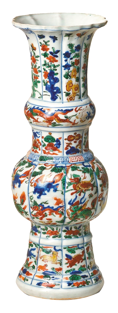 文中是明万历时期的五彩瑞兽纹葵瓣式花觚,高36.5厘米,口径12.5厘米,足径11.3厘米。觚呈八葵瓣式,敞口,长颈,圆腹,近足处外撇,通体以白釉为地,施以青花、矾红、绿、赭、黄五彩纹饰,颈部八面各绘花卉、草虫、洞石纹、双龙穿花纹和折枝灵芝托八宝纹,腹部绘异兽、苍松和祥云纹,胫部绘折枝花卉、异兽、祥云纹等。口沿下双长方框青花横书“大明万历年制”六字楷书款。