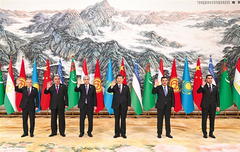5月的西安,花团锦簇,生机盎然。灞河之滨的西安国际会议中心,中国和中亚五国国旗迎风飘扬,与中国-中亚峰会会标交相辉映,千年古都迎来一场历史与未来交融的盛会。