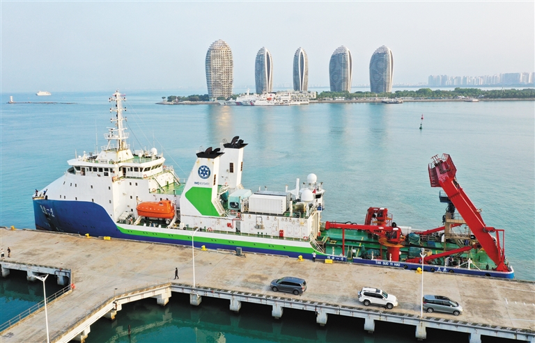5月21日,完成南海西北陆坡一号沉船第一次考古调查的“探索一号”科考船携“深海勇士”号载人潜水器抵达三亚(无人机照片)。5月21日,国家文物局、海南省人民政府等单位在海南三亚发布我国深海考古工作近期取得的重大进展。2022年10月,在我国南海西北陆坡约1500米深度海域发现两处古代沉船。沉船水下永久测绘基点已于2023年5月20日布放,并进行初步搜索调查和影像记录,开启了中国深海考古新篇章。
