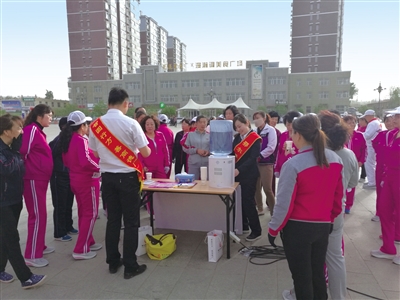 他们“钉”住广场公园不放。2016年在伊东广场和水上公园组织“一杯水公益活动”,每天5点起床,不吃早点,搬上饮水机,拿着跳绳、毽子,学习跳广场舞,8点回到单位开晨会,晚上发传单。就这样坚持了4个月,从最开始一杯水都没人喝,到最后加微信、留电话,主动上门存款,沙圪堵支行“钉”赢了。