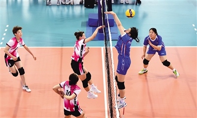 5月25日,内蒙古师范大学女子排球队与内蒙古医科大学女子排球队(蓝色)激烈角逐。本报记者 王磊 摄
