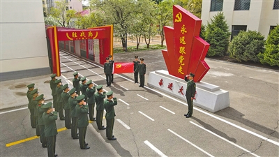 近日,武警内蒙古总队呼和浩特支队开展“永远跟党走  强军担重任”主题党日活动,通过重温入党誓词、聆听红色故事等,持续深入学习贯彻党的二十大精神,不断加强党员政治理论学习,提高政治素养,锤炼品格,强化忠诚。