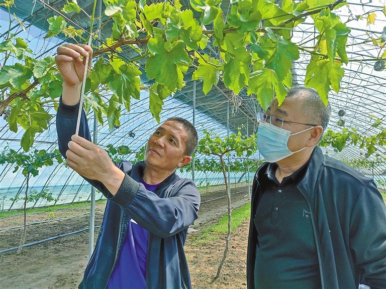 今年以来,乌海市压紧压实抓党建促乡村振兴责任,各乡村振兴驻村工作队积极开展一线调查研究工作,为特色产业发展持续“造血”谋思路、想法子。图为海勃湾区千里山镇巴音乌素村乡村振兴驻村工作队队员近日到种植户家中察看葡萄长势。路静 摄