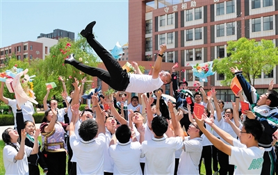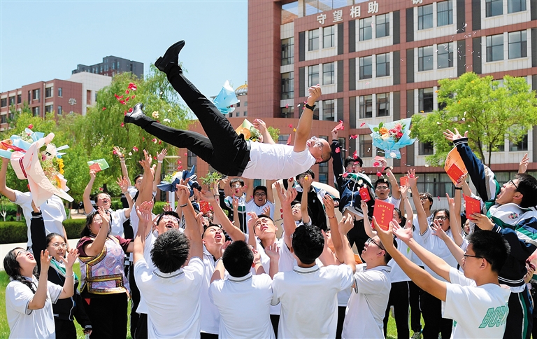 6月3日,北京四中呼和浩特分校高三毕业生为表达感激之情, 把老师托起抛向空中。当日,该校举行了2023届高三毕业典礼,以此祝福高三学子,为他们的高中阶段学习生活画上圆满的句号。全体高三师生齐聚一堂,共同见证这一难忘的时刻。本报记者 闫晨光 摄