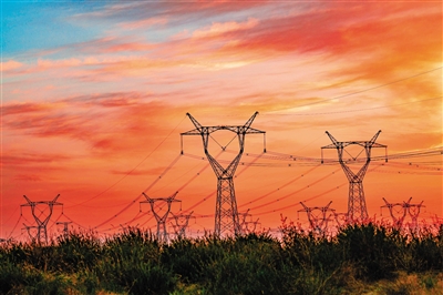 仲夏时节,鄂尔多斯市鄂托克前旗上海庙镇陶利嘎查,特高压走廊与夕阳和草原构成一幅和谐恢弘的画卷。据了解,由鄂托克前旗境内三座电厂提供电能的上海庙至山东±800千伏特高压直流输电工程,是目前世界上输电容量最大的特高压直流输电工程,通过特高压走廊将当地丰富的电能源源不断地输送到华东地区,有力地助推区域经济高质量发展。