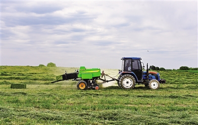 6月10日,牧草打捆机在鄂托克前旗昂素镇紫花苜蓿地里作业。进入6月,内蒙古自治区鄂尔多斯市鄂托克前旗大面积种植的紫花苜蓿进入了成熟收获期,当地种植户抢抓晴好天气展开收割,确保稳产丰收。近年来,该旗借助高效节水技术,持续打造优质牧草基地,种植紫花苜蓿、燕麦草等牧草品种,每年加工干草和青贮饲料超过80万吨,除供应当地养殖企业外还销往内蒙古各地,带动了种植户增收。