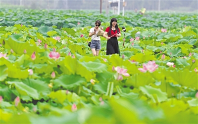6月13日,游客在柳州市柳江区百朋镇万亩荷塘里游玩。时下,广西柳州市柳江区百朋镇万亩荷塘里的各色荷花竞相绽放,吸引游客前来赏花游玩。 新华社发