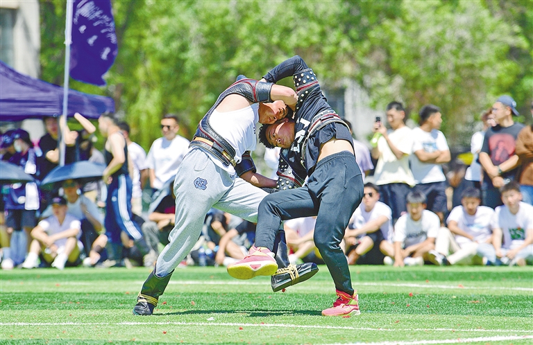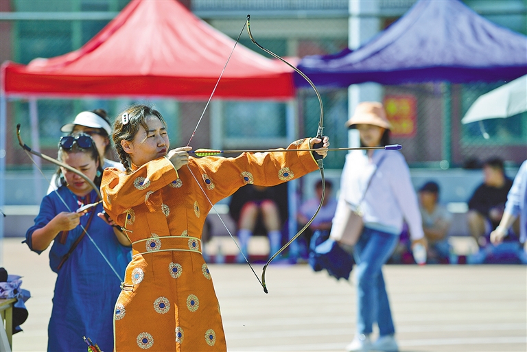 搏克、射箭、布鲁等传统体育竞技趣味十足,武术、舞蹈、合唱等文艺表演精彩纷呈。在呼和浩特民族学院那达慕文化节上,田径运动会与中华传统文化完美结合,展示了师生们朝气蓬勃、奋发向上的精神风貌。