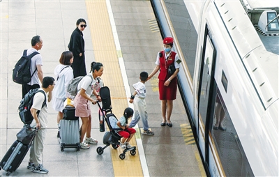 7月1日,2023年暑运拉开帷幕,在呼和浩特火车东站内,旅客正在登车。为保障旅客暑期出行安全,呼和浩特火车东站全面优化旅客进站、候车、乘车和出站组织方案,加强客流密集场所引导,为出行有困难的旅客提供帮助。
