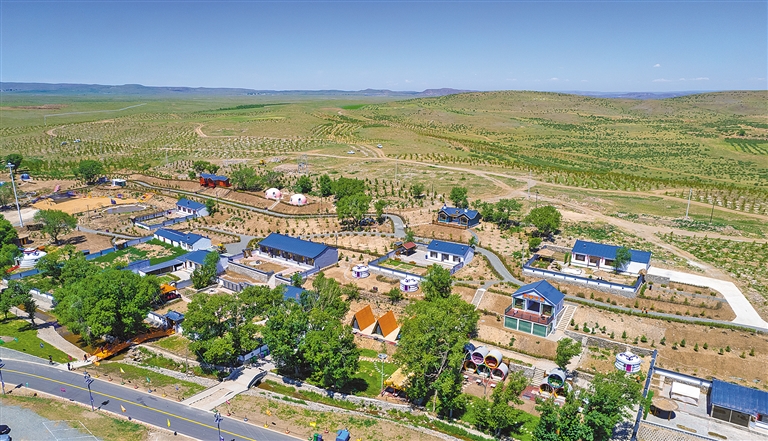 航拍镜头下的乌兰察布市察右前旗平地泉镇京西牛村部落。当地依托优质旅游资源,围绕房车、民宿、休闲、餐饮、娱乐、星空体验等,打造察右前旗综合休闲示范民宿运营基地。通过京西牛村部落的旅游带动,盘活周边闲置房屋和土地,拉动当地经济发展,受益群体辐射周边10余个村落,提供就业岗位100余个,实现了周边村民就近就业。