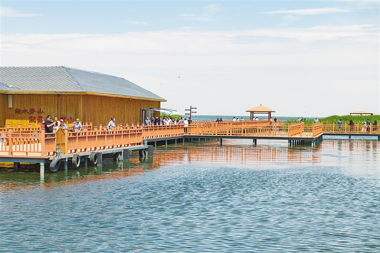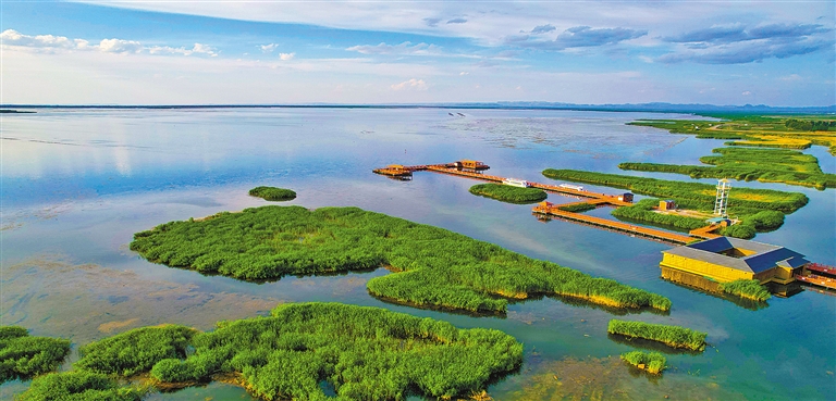 盛夏时节,乌梁素海天蓝水碧、水鸟翔集、芦苇摇曳,吸引着来自全国各地的游客前来游玩。这颗祖国北疆的“塞外明珠”正焕发着璀璨的光彩。乌梁素海位于黄河“几字弯”顶部,是黄河北支的一段河迹湖。上世纪90年代,随着城镇化、工业化的飞速发展等原因,乌梁素海受到污染,生物多样性遭到破坏,生态功能退化,有黄河“自然之肾”之称的乌梁素海一度成为“生态之患”。近年来,巴彦淖尔市按照“生态补水、控源减污、修复治理、资源利用、持续发展”的治理思路,对乌梁素海进行综合治理,通过点源、面源、内源多措并举,特别是直接引入黄河水实施大规模的生态补水,乌梁素海水质逐步好转,鸟类、鱼类数量有所增加,湖体生态功能逐步恢复,治理取得阶段性成果。为了促进湖区生态自然修复,乌梁素海实施了渔民上岸工程,曾经靠水吃水的渔民,如今做起了特色种植,搞起了旅游业、手工业。内蒙古加大水生态保护治理力度,今年已向乌梁素海补水3.2亿立方米,水面面积稳定在293平方公里,水质持续改善。坚持尊重自然、顺应自然、保护自然,内蒙古继续抓好“一湖两海”及察汗淖尔等重点河湖水生态保护治理巩固提升,加强生态脆弱区生态补水。推进河湖复苏,扎实推动水利高质量发展。