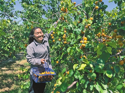 盛夏时节,巴彦淖尔市五原县复兴镇占地500亩的庄生经济林产业园中金杏飘香,采摘杏子的农民喜笑颜开。