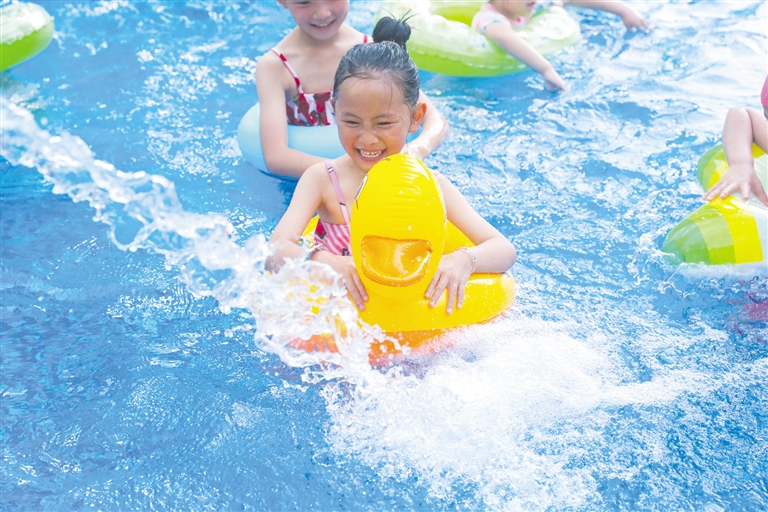 7月10日,小朋友在河南省信阳市光山县一游泳馆戏水游玩。连日来,多地持续高温,众多市民和游客选择亲水消暑,享受夏日清凉。新华社发