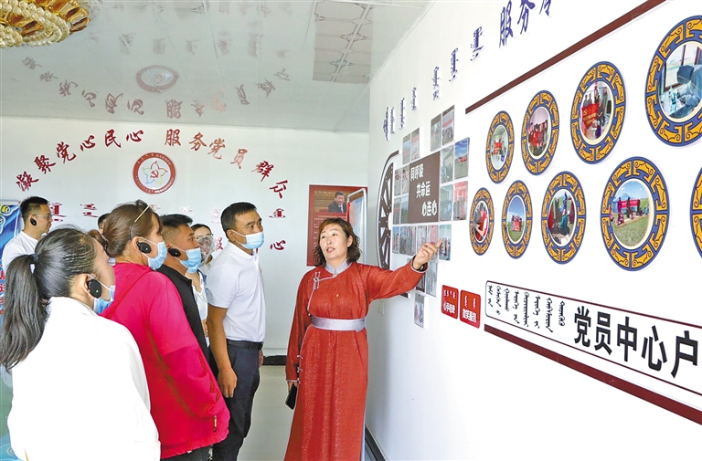 近日,呼伦贝尔市陈巴尔虎旗举办全旗嘎查党组织书记乡村振兴“比武争星”活动,采取知识竞赛、现场介绍、项目基地观摩、现场考评打分等方式,比学习、比发展、比服务,有效激发了乡村振兴内生动力。图为白音布日德嘎查党组织书记向“比武争星”考评组介绍服务群众工作开展情况。其乐木格 摄