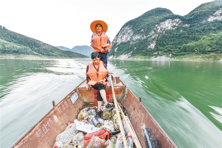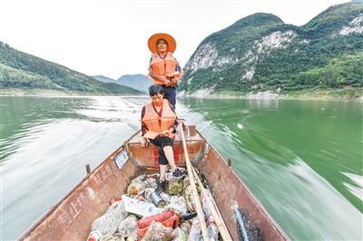 7月10日,卢锡永、冉茂英夫妇驾驶小船在乌江上转运打捞的漂浮物。1986年,卢锡永、冉茂英结为夫妻后,在家附近的乌江双池渡口开渡船送人过江。在没有人渡江的时候,夫妻俩就主动清理乌江边上的漂浮物,宣传环保,巡河护河,甘当乌江边上的义务清洁工和环保宣传员。这一干,就是37年。