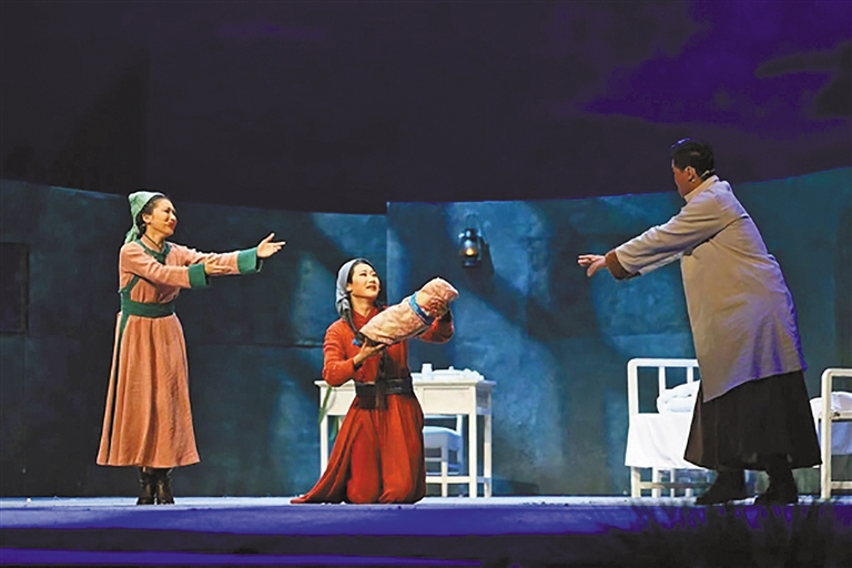 老年都贵玛这个角色设置得好,让剧情在假定情景中延展,有张有弛,形成节奏感。2019年,都贵玛被授予“人民楷模”国家荣誉称号。她激动地说,获得这个奖章是我一生中最大的幸福,是我这辈子最美好的回忆。这不是给我的,是颁给所有“草原母亲”的。老年、青年都贵玛同时出场,还有交流,可以说,这出戏把戏剧之为戏剧的假定性用足了。但个人感觉角色作用发挥得还不够,力度还差些,不应只是穿针引线、勾连剧情,给她的道白更深沉一些、更具人生的哲理性、心理内涵更丰富一些,应该更好。解决这个问题,不应只在量上做文章,不用增加戏份儿,而应在质上提纯,反复打磨推敲,臻于完善。此外,演员的表演,还有提升的空间,还可在二度创作中把形象塑造得更扎实。