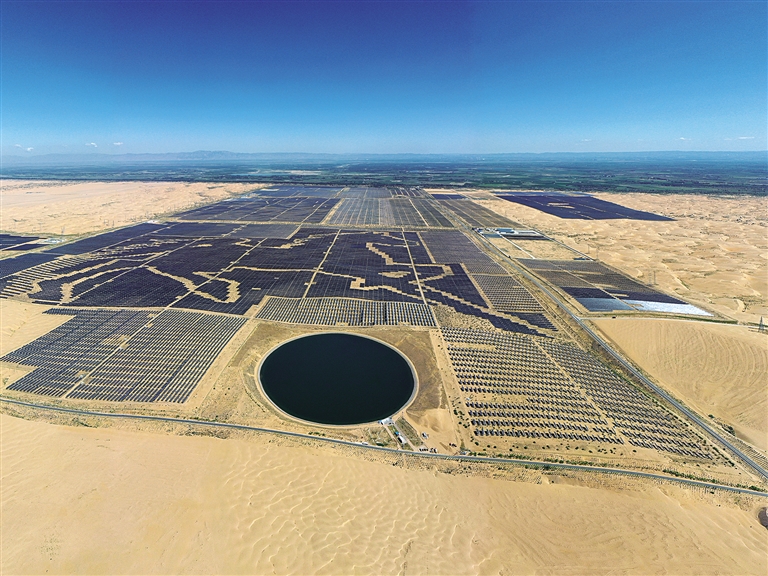 7月18日,达拉特光伏发电应用领跑基地的光伏板熠熠生辉。该基地位于库布其沙漠中段,是国家第三批光伏发电应用领跑基地和奖励激励基地。截至2023年6月底,达拉特光伏电站已累计输出绿电29.77亿千瓦时,累计节省标煤119.08万吨,减少二氧化碳排放296.8万吨。本报记者 王晓博 摄