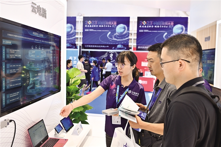 7月18日,与会者在大会设置的数字技术与应用成果展的中国移动展台了解云电脑技术方案。当日,由中国互联网协会主办,北京经济技术开发区管委会、北京市通信管理局、工业和信息化部新闻宣传中心联合主办的2023中国互联网大会在京开幕,大会以“促进数实融合 赋能千行百业”为主题,聚焦互联网基础设施、技术创新、融合发展、网络治理等多个热点板块,大会将持续至20日闭幕。 新华社记者 李鑫 摄