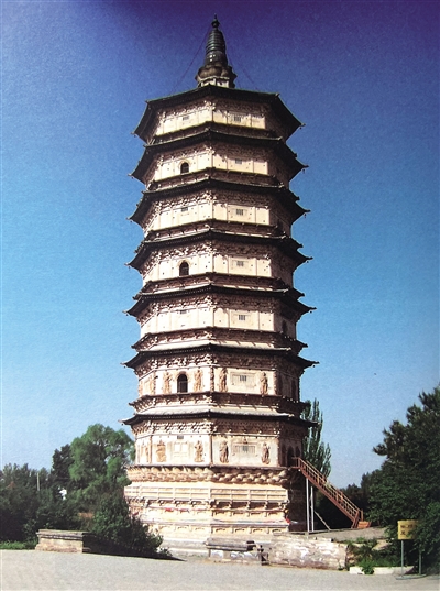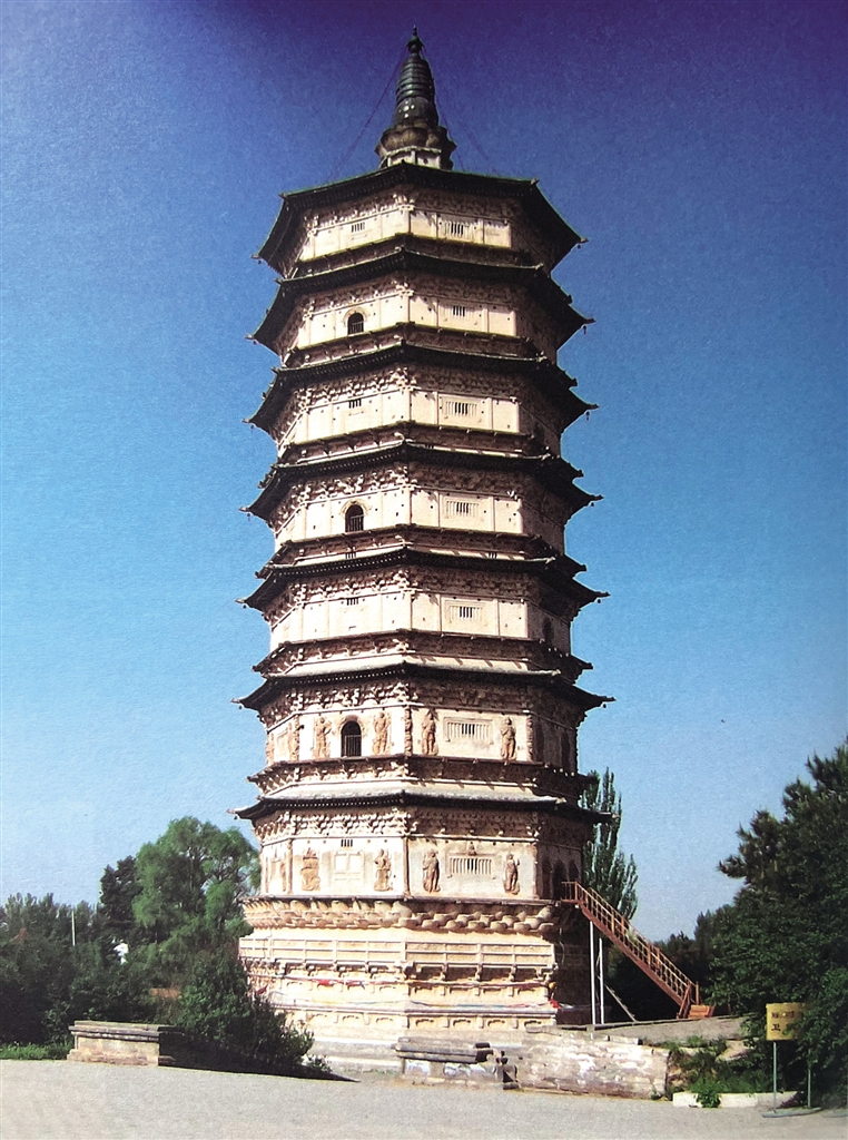 据史料记载:辽代在全国广建庙宇,在公元983年至1101年间达到鼎盛。现在山西省大同市、内蒙古自治区呼和浩特市保存的辽代佛教建筑,基本是辽兴宗至辽道宗时期所建造。其中,万部华严经塔(约公元965年—969年)位于丰州故城西北角,因为塔身涂了白垩土,通体洁白,故俗称白塔。洁白无瑕的白塔,在碧空万里、白云漂浮的天宇下,犹如一柄雪白的利剑,直插蓝天,与白云交相辉映,阳光从塔尖洒下,塔身瑰丽多彩,古朴雄浑,这就是呼和浩特八景之一“白塔耸光”。