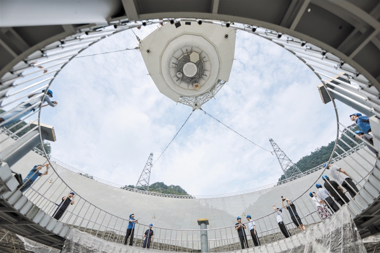 7月26日,专家在“中国天眼”馈源舱前进行现场考察(维护保养期间拍摄)。我国科学家领导的国际合作团队近期利用“中国天眼”发现,著名微类星体GRS 1915+105的黑洞存在亚秒级低频射电准周期振荡现象,就像微弱的射电“脉搏”。这是国际首次在射电波段观测到黑洞“脉搏”,有望打开黑洞射电观测和理论研究的新思路。该研究由武汉大学天文学系与中国科学院国家天文台团队牵头完成,相关成果7月27日在国际学术期刊《自然》发表。新华社发