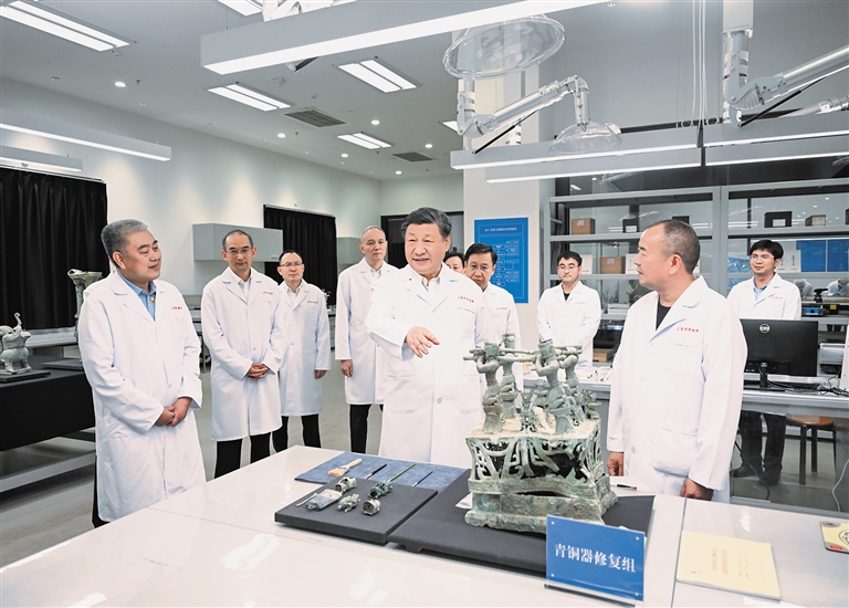 7月25日至27日,中共中央总书记、国家主席、中央军委主席习近平在四川考察。这是26日下午,习近平在位于德阳市广汉市的三星堆博物馆文物保护与修复馆,同现场工作人员亲切交流。 新华社记者 谢环驰 摄