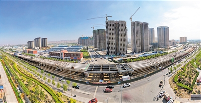 7月30日,航拍包头市G110(民族东路-G210)节点快速化改造工程施工现场。G110国道节点快速化改造工程,改造长度13.70公里,工程共新建跨地道桥1座、跨线桥6座,拆除并新建跨河桥1座。改造完成后,G110国道高峰时段车辆行驶时间仅为20分钟,较改造前节约18分钟,可有效提高G110国道的通行效率和质量。本报记者 孟和朝鲁 摄