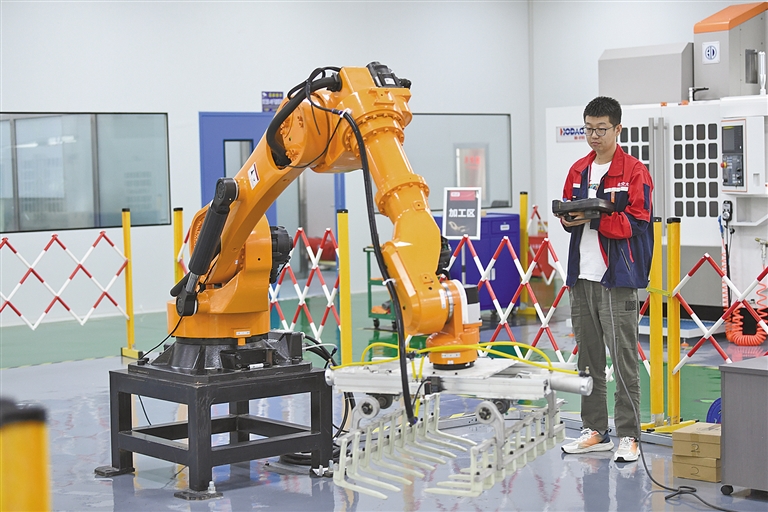 7月28日,工作人员正在调试机器人。位于包头市稀土高新区的内蒙古北科交大机器人有限公司研发生产适用于各种工业制造领域的机器人。目前,已就钢铁、有色金属、稀主新材料、风电、光伏、汽车零部件等行业研发多款机器人系统,同时形成了焊接、打磨、 搬运、上下料、组装、检测、消防等多个应用场景的产品体系,广泛应用于各个行业。本报记者 孟和朝鲁 摄