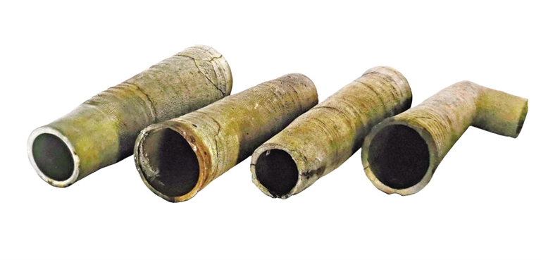 在乌海博物馆展出的一套汉代绳纹陶水管,就是从新地古城遗址发掘出来的,这套水管一共4件,为泥质灰陶,表面装饰粗绳纹。其中3件呈直筒形,一端稍粗,端口微撇,另一端稍细,接口处表面光滑,另有1件水管带有90°弯头,在拐弯处刻画有“A”符号。每节水管应是按着符号由这一节的小口套入另一节大口内,如此节节紧密套扣,便于排水。无论是实用性还是美观度,都堪与现代使用的水管媲美。