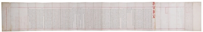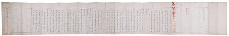 明代赵秉忠《状元卷》收藏于山东省青州市博物馆。《状元卷》十九折册页,前四折是仿宋体书写作者及其上三代的简历,首折上方钤有篆书“礼部之印”四字方印,末折骑缝处亦钤此印二分之一。这一部分是被弥封的,封条上盖有“弥封关防”的长印。后十五折为正文,用工整小楷写成,每折六行,全文共2460字。正文首页右上顶天头为明万历皇帝朱翊钧朱书“第一甲第一名”六个大字,后列着9位读卷官的职衔姓名,卷尾印有“印卷官礼部仪制清吏司署郎中事主事臣朱敬循”大字一行。《状元卷》通高47.6厘米,横长共268厘米,每折宽14.1厘米,三层宣纸装裱,封面、封底系全绫装裱。