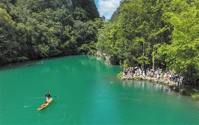 8月15日,游客在贵州省荔波小七孔风景区游玩(无人机照片)。日前,前往贵州省荔波小七孔风景区游玩的游客激增,景区各部门通力合作,服务游客,每天迎客超过6.2万人次。据悉,随着8月上旬贵南高铁贵阳至荔波段开通运营,享有“地球绿宝石”美誉的荔波迎来高铁时代。 新华社发