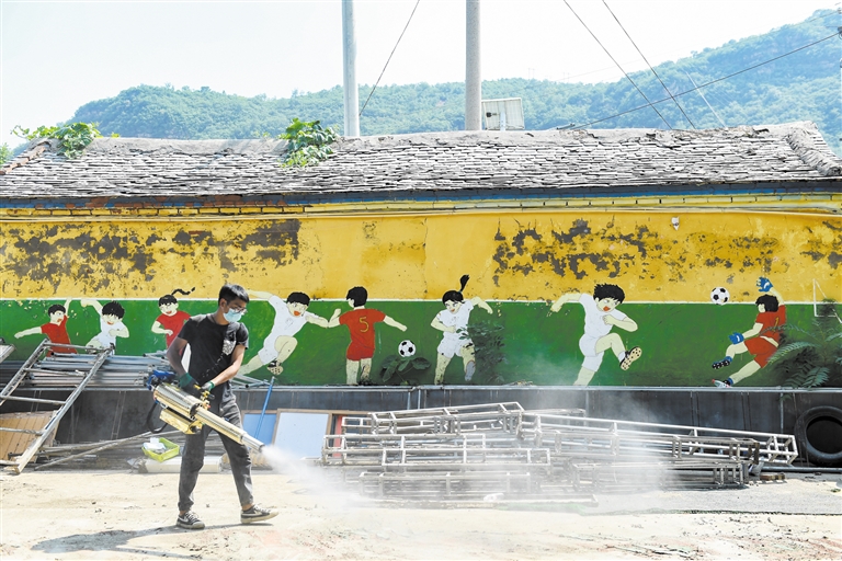 8月15日,北京市房山区河北镇中心幼儿园东庄子分园教师李笑博在园内消杀。近日,北京市门头沟区、房山区等因特大暴雨灾害受损的学校正全力进行灾后恢复重建和教育教学准备工作。各地根据具体情况,推进学校清淤消杀、环境治理、维修校舍、学生借址就读等,为即将到来的开学做准备。 新华社记者 陈钟昊 摄