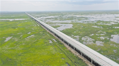 8月15日,呼伦贝尔市海满高速二卡湿地特大桥施工现场,桥下的二卡湿地自然保护区芦苇荡漾,万鸥翔集。据介绍,原批复的海满高速公路工程可行性研究报告,以原有路基为主穿越满洲里二卡湿地。为保护湿地生态系统,经研究论证,海满项目建设管理分公司将海满高速公路二卡湿地段调整为以桥梁为主建设方案,为此新增投资约10.15亿元。目前,二卡湿地“路改桥”工程新建四座桥梁主体桥面铺装已完成,正在进行路面工程施工,预计2023年11月末,全线交工验收。本报记者 高慧 摄