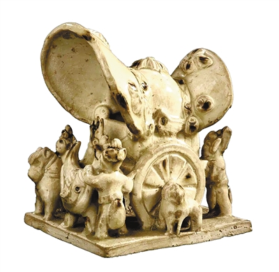 此车1992年出土于扬州市念四桥薛庄,它反映了唐代制瓷工艺的高超水平,刻画了贵族妇人出行的场景。器物通体施青白釉,人物、动物以及车的主要部分以褐彩点缀的方式呈现,做工非常细致。