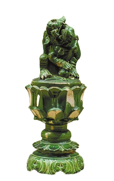 这件吉州窑绿釉狮盖香薰炉1963年出土于安徽省宿松县一座北宋墓葬中,现藏安徽博物院。狮盖香薰炉通高32厘米,口径12.2厘米,足径12.3厘米,由炉座和盖两部分组成,可拆合。盖钮作狮子抢绣球状,狮首高昂,尾巴上翘,颈部挂3枚铃铛,蹲在莲蓬果上,前足踏彩球,姿态雄健。盖体中空,熏香时香气从微张的狮口溢出。香薰炉身呈莲瓣状,圈座外雕莲瓣纹,有的莲瓣上特意不施釉,露出黄白色的胎,绿、白相映,显示出莲花花瓣的阴阳向背,别有韵味。