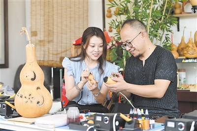 近日,游客在东达山度假村内体验工艺品创作。包头市青山区将西边墙、东达沟、福合当三个村统一规划建设“东达山度假村”,度假村集艺术创作与展示、儿童娱乐与研学、农作物种植与采摘、休闲养生与露营为一体的大型综合性旅游基地,形成“吃在西边墙,玩在东达沟,住在福合当”的旅游特色,用特色旅游推进乡村振兴。 本报记者 孟和朝鲁 摄