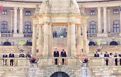 8月的比勒陀利亚,晴空万里,惠风和畅。总统府广场鲜花盛开,中南两国国旗迎风飘扬。在总统摩托车队护卫下,习近平乘车抵达总统府,拉马福萨在下车处热情迎接。两国元首登上检阅台。仪仗队行持枪礼,军乐队奏中南两国国歌,现场鸣放21响礼炮。习近平检阅南非仪仗队。两国元首同双方陪同人员一一握手。