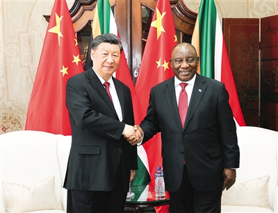 习近平指出,近年来,金砖国家秉持开放包容、合作共赢的金砖精神,书写了不同制度、不同文化、不同地域国家携手发展的精彩故事,成为南南合作的一面金字招牌。南非为这次金砖国家领导人会晤作出精心筹备,我对此高度赞赏。我期待同金砖国家领导人一道,共商新时代金砖团结发展大计,推动会晤取得丰硕成果,推动全球治理朝着更加公正合理的方向发展。