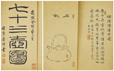 康熙本《七十三壶图》稿本,原为著名藏书家朱鼎煦先生收藏。先生过世后,其家属遵照其遗愿,于1979年将先生的10万余卷藏书、900余幅字画、800余件器物,捐给了天一阁博物院。康熙本《七十三壶图》便是10万卷书中的一本。雍正本《七十三壶图》稿本,为天一阁上世纪八十年代接受社会流散文物收藏。两稿本作者同为普荷。两稿本相比较,康熙本好于雍正本,雍正本开本略小一点,内容上前后排列顺序有些变化。相同的图,雍正本更像是临摹康熙本,壶图及书法均不如康熙本。康熙本《七十三壶图》,扉页上写“康熙癸卯春三月”(行书)“七十三壶图”(隶书)“晋宁普荷书”(行书),竖排各一行。右下角钤“子孙保止”,篆文方印;左边“晋宁普荷书”,下端钤“普荷”“担当”,篆文方印。