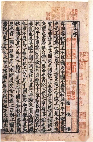 《管子》宋代出现刻本。国家图书馆收藏的宋浙刻本,是现存《管子》最早的刻本。这一版本的《管子》,每半页12行,每行23字、24字不等,白口,左右双栏,单鱼尾,注文为双行小字。首列杨忱管子序,次列管子目录,次列刘向进书序,书后有张嵲《读管子》一文。书中钤有若干名家的藏书印,包括文征明、王宠、文伯仁、季振宜、徐乾学、黄丕烈、汪士钟、陈澄中等。这些藏书印展示了《管子》自明代以来迭经名家收藏的历史轨迹。